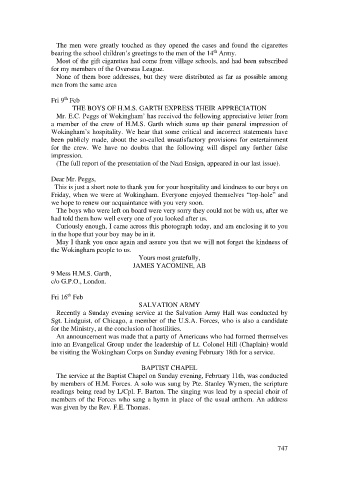 by members of H.M. Forces. A solo was sung by Pte. Stanley Wymen, the scripture